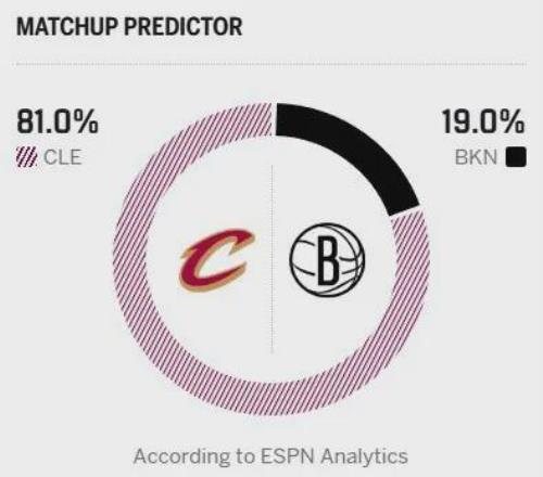 今日一戰,騎士的新核哈登迎來複出,米切爾將繼續缺陣。即便少了一位核心,騎士還有阿倫與莫布裏的雙塔坐鎮,實力依舊占據明顯上風。不出意外,騎士有望在客場輕鬆拿下比賽,終結連敗頹勢。賽前,ESPN給出本場勝率預測,騎士高達81%,籃網隻有19%。