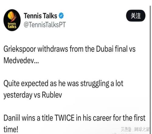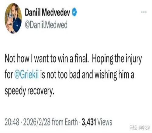 “這不是我想贏得決賽的方式,”梅德韋傑夫在確認對手退賽後,於X平台發文寫道,“希望格裏克斯普爾的傷勢不重,祝他早日康複” 。這位30歲的俄羅斯名將整屆賽事未失一盤,用完美的表現等待著一個本應完美的句號,卻等來了意外的退賽大禮和窗外呼嘯的防空警報。
