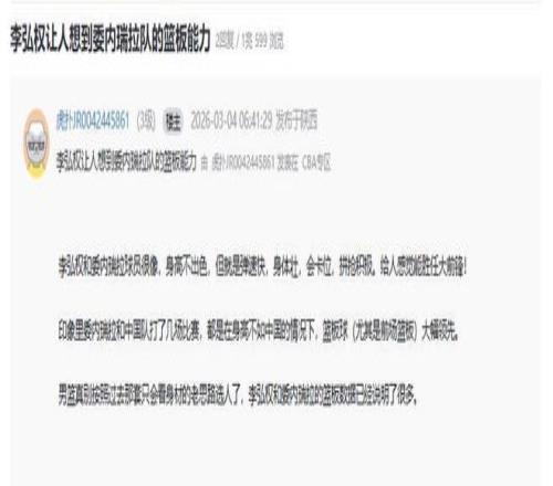 球迷們更是分析了李弘權現象,希望中國隊員甚至所有CBA球員能從李弘權身上學點什麽。球迷分析道:李弘權和委內瑞拉球員很像,身高不出色,但就是彈速快,身體壯,會卡位,拚搶積極。給人感覺能勝任大前鋒!印象裏委內瑞拉和中國隊打了幾場比賽,都是在身高不如中國的情況下,籃板球(尤其是前場籃板)大幅領先。男籃真別按照過去那套隻會看身材的老思路選人了,李弘權和委內瑞拉的籃板數據已經說明了很多。