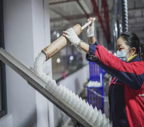 貴州省錦屏縣的某羽毛球生產基地,工人將羽毛球半成品投入生產機器(2022年1月5日攝)。新華社記者 陶亮 攝