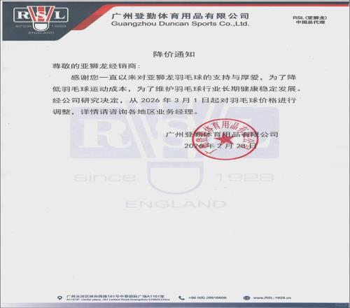2月28日,羽毛球的龍頭企業亞獅龍,也發布了降價通知。超牌、威肯……不少品牌陸續跟上降價的步伐。尤尼克斯(YONEX)至今未發布官方降價通知,但終端價格已隨庫存消化開始鬆動。