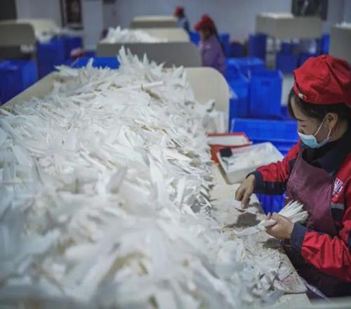 貴州省錦屏縣的某羽毛球生產基地,工人在生產車間內將鵝毛挑選分類(2022年1月5日攝)。新華社記者 陶亮 攝