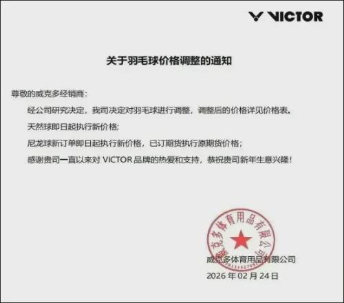 2月24日,VICTOR威克多率先宣布調價。接著斯莊格、齊克努也宣布調價,齊克努表示根據市場羽毛價格調節,公司決定對全91海角黄色免费下载羽毛球降價6元/筒。