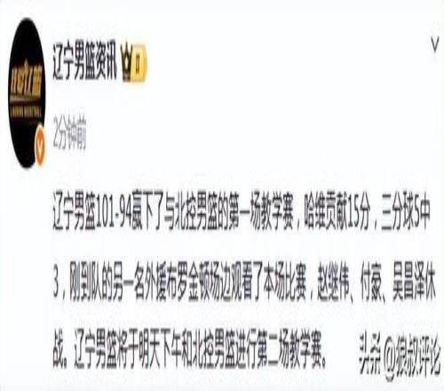 根據遼寧博主的報道,遼寧男籃101-94贏下了與北控男籃的第一場教學賽,哈維貢獻15分,三分球5中3,剛到隊的另一名外援布羅金頓場邊觀看了本場比賽,趙繼偉、付豪、吳昌澤休戰。遼寧男籃將於明天下午和北控男籃進行第二場教學賽。
