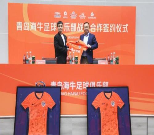 “3月4日,青島海牛足球俱樂部2026賽季出征儀式在城陽區青春足球場圓滿舉行。2026賽季,青島海牛足球俱樂部將攜手青島本土品牌青島啤酒、青島飲料集團、青島銀行、青島農商銀行一同為這座城市的榮譽而戰,出征儀式中,俱樂部與該4大品牌進行了簽約儀式,攜手向前。活動期間,新賽季球衣由部分球員展示,胸前廣告‘嶗山可樂’首次亮相。”