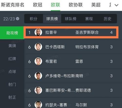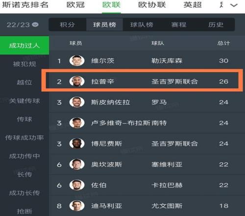 第二個,拉普辛還是歐聯杯助攻王,22到23賽季,他在歐聯杯完成4次助攻,並列那個賽季歐聯杯的助攻王,而且也是歐聯杯成功過人榜第2名,第1名是誰呢?就是現在身價1.1億歐的利物浦球星維爾茨。