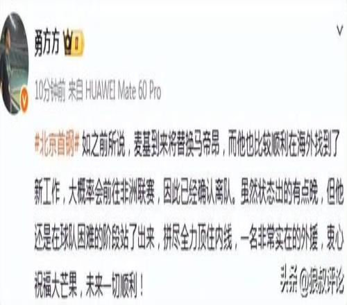 北京時間3月5日,根據媒體人“勇方方”的報道,麥基到來將替換馬帝昂,而他也比較順利在海外找到了新工作,大概率會前往非洲聯賽,因此已經確認離隊。雖然狀態出的有點晚,但他還是在球隊困難的階段站了出來,拚盡全力頂住內線,一名非常實在的外援,衷心祝福大芒果,未來一切順利! 。