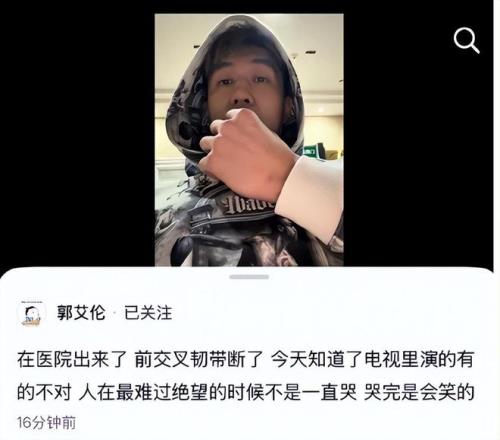 比賽結束之後,郭艾倫在個人社交賬號上發布了一條視頻,專門回應了自己的情況,並官宣了傷情:前交叉韌帶斷了。