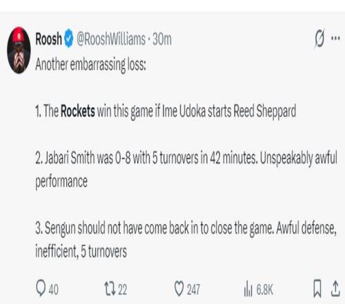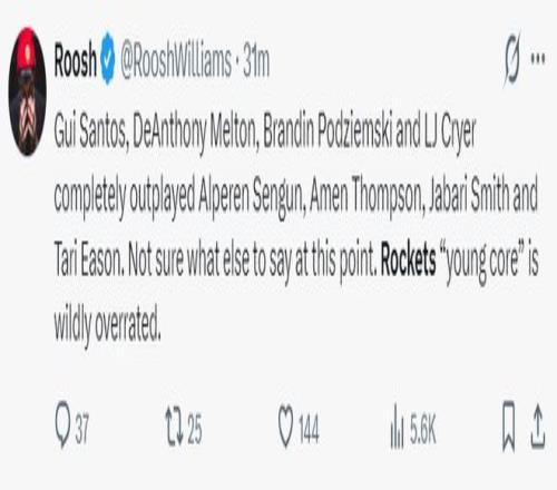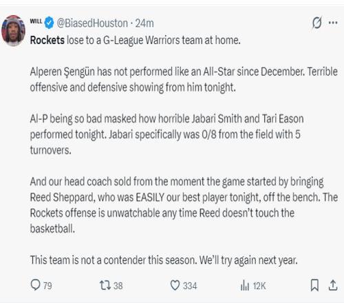 他繼續寫道:火箭隊在主場輸給了發展聯盟的勇士!申京自12月以來表現一直都沒有達到全明星水準此役攻防都糟糕;