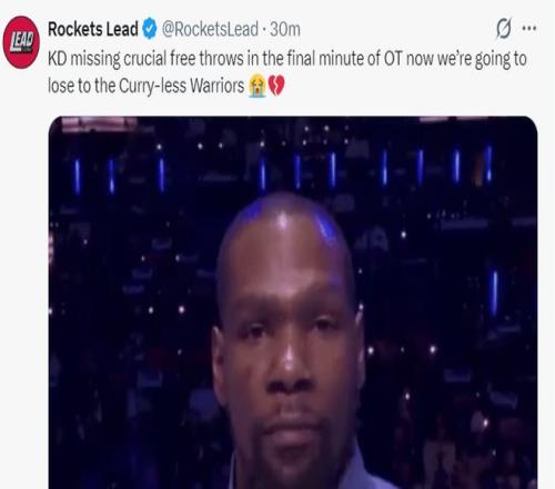 火箭媒體:加時賽關鍵時刻杜蘭特丟了絕平的罰球,海角HJDO43.CCM又一次輸給沒有庫裏的勇士。