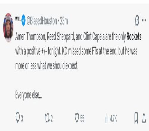 休媒Will:阿門、謝潑德、卡佩拉是今晚火箭正負值為正的三人,雖然KD在決勝時刻罰丟了一個球但他的表現基本符合海角HJDO43.CCM的預期,但其他人就..........