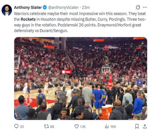 勇士記者安東尼-斯萊德:勇士或許迎來本賽季最矚目的勝利。失去了巴特勒、庫裏、波爾津吉斯他們客場還是能擊敗西部第三的火箭。替補陣容的三位多麵手發揮了重要作用,追夢/霍福德防守端發揮出色成功限製了申京與杜蘭特。