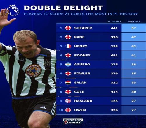 北京時間3月6日,德轉統計出了英超曆史單場進球2+場次最多的10名球員,阿蘭-希勒57場排名第1,哈裏-凱恩47場第2,亨利42場第3。