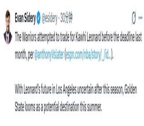 北京時間3月6日,據勇士隊記Slater報道,NBA交易截止日前,消息人士透露,勇士曾詢問過小賈倫-傑克遜、字母哥,也曾致電詢問萊昂納德的交易可能(當時快船看似有意願交易)。
