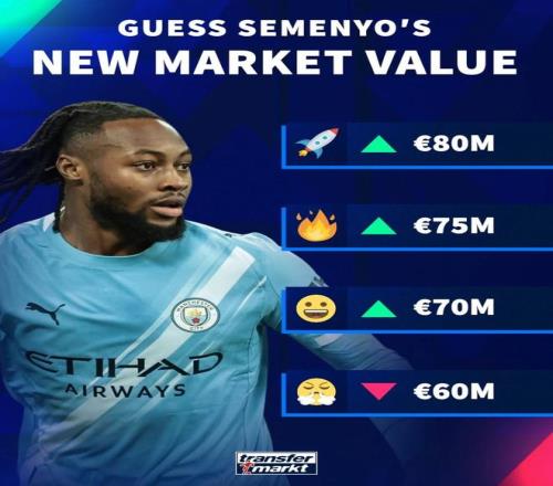 在德轉3月9日將會更新英超球員身價的情況下,他們也對現有身價6500萬歐元的塞門約進行了身價預熱。