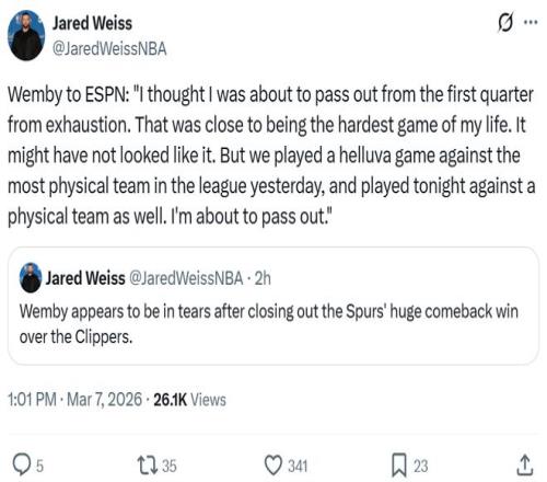 雖然隻是一場常規賽,但能夠完成如此誇張的大逆轉,對手還是昔日核心小卡帶領的快船,賽後馬刺球員十分激動,全員瘋狂慶祝,文班更是直接抱著隊友喜極而泣。