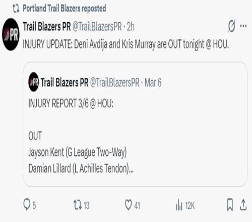開拓者的阿夫迪亞、樂福、克裏斯-穆雷等人都因傷無法登場,楊瀚森還在G聯賽。