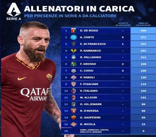 北京時間3月10日,德轉統計出了意甲20家俱樂部現任主帥球員生涯的意甲出場數排名,熱那亞主帥德羅西以459場排名第一,那不勒斯主帥孔蒂371場第二。