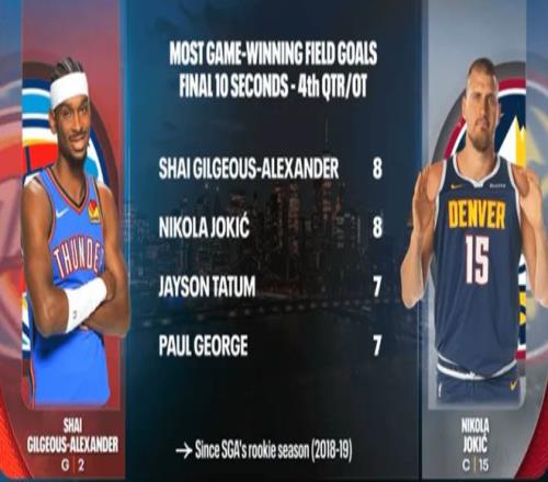 除此之外,自SGA進入聯盟後,在終場前10秒內完成準絕殺/絕殺次數最多的球員是約基奇、SGA,這兩人都是8次,所以關鍵球能力約基奇也不輸亞曆山大。