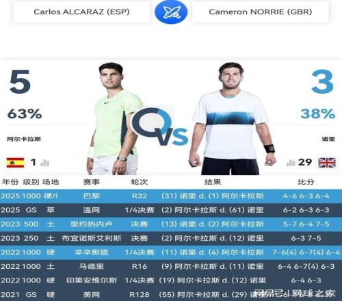 其四、兩人最近一次交鋒,世界第一阿爾卡拉斯竟被諾裏逆轉擊敗,遭遇當頭棒喝,獲得慘痛教訓。2025年巴黎大師賽第二輪,剛在美網奪冠重返世界第一的阿爾卡拉斯,首盤獲勝之後竟然連輸兩盤,慘遭諾裏逆轉淘汰。這是諾裏職業生涯第一次戰勝時任世界第一,一舉終結了阿爾卡拉斯2025賽季大師賽17連勝、連續九站賽事闖進最後決賽奪取七個冠軍的傲人戰績。
