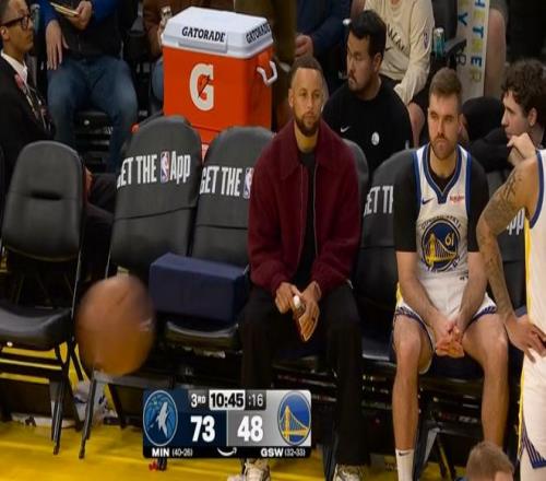 第三節開場勇士大比分落後庫裏在場邊坐著眼神很空洞,這時候替補席隻剩下庫裏、斯潘塞、萊昂斯三人(實際上算2.5人因為庫裏不能打)。