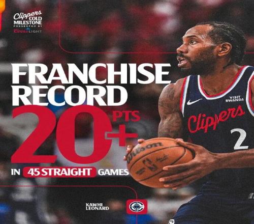 倫納德盡管隻打了不到26分鍾,可出手23次中13球砍下31分6板2斷,已經連續45場比賽得分20+創造快船隊史最長紀錄,之前該紀錄保持者為1972年榜眼秀鮑勃-麥卡杜。