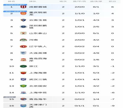 與蓉城一樣,泰山、河南隊也是2戰全勝,泰山在第2輪以2-1擊敗老對手國安,但他們2支球隊由於被扣了6分,因此現在積0分,暫列積分榜第5、6位。墊底球隊是津門虎,今年負10分開局,前2輪1分一球未進,現在負9分。