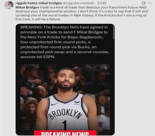 今天有尼克斯球迷在網上開噴:“布裏奇斯的交易不僅會毀掉球隊的未來,還會徹底斷送球隊的奪冠窗口期。毫不誇張地說,如果尼克斯最終沒能用這套核心陣容贏得總冠軍,當初那筆交易最終會成為NBA曆史上最糟糕的交易之一。”