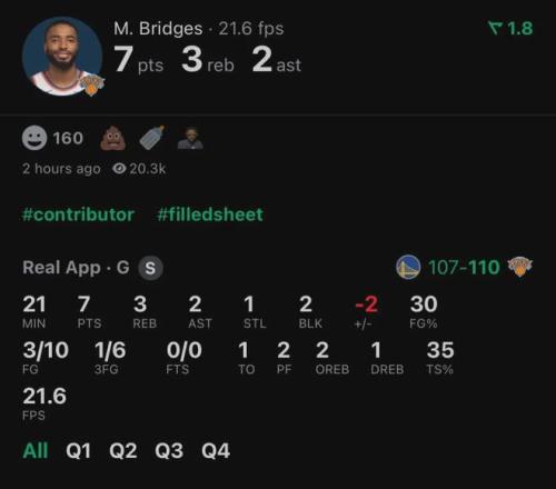 北京時間3月16日,NBA常規賽,尼克斯主場110-107險勝勇士。尼克斯球員米卡爾-布裏奇斯首發出戰21分鍾,投籃10中3,三分6中1,得到7分3籃板2助攻1搶斷2蓋帽1失誤2犯規,正負值-2。最近3場比賽,大橋三分合計15中3。