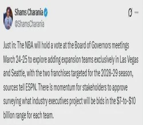 爆料王Shams:NBA將於3月24日至25日召開董事會會議,就在拉斯維加斯和西雅圖兩地新增兩支球隊的議題進行投票表決。