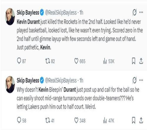 名嘴斯利普-貝勒斯瘋狂朝他開炮:為什麽KD不直接突破到籃下?他可以打無球啊,這樣他就能輕鬆躲過雙人包夾接球完成中距離投籃。他持球就被湖人逼到半場的位置,太奇怪了。