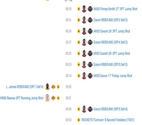 最慘烈的是這場失利也是杜蘭特一手締造,終場前5分35秒火箭都還領先1分,緊接著杜蘭特5分30秒與5分25秒連續兩次出手三分打鐵(實際上他是有空間突破的,但他就是不突破癡迷三分,如果突破進一個那就領先到3分)