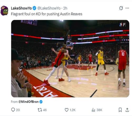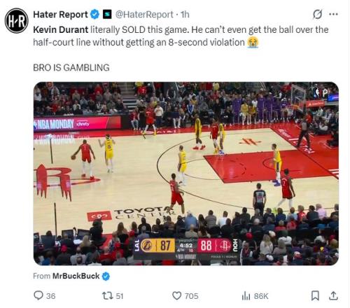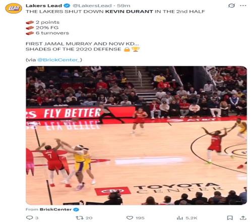 湖人媒體Lakers Lead還專門製作了杜蘭特整個下半場的拉胯集錦,各種的被包夾失誤、出手打鐵等等。