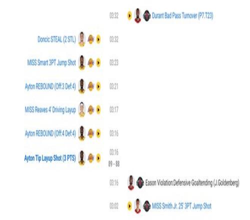 終場前4分52秒杜蘭特8秒不過半場低級失誤,也是這個失誤讓艾頓籃下補籃幫助湖人反超,終場前3分32秒杜蘭特又是一個想要穿過兩人包夾的傳球失誤,不得不說KD這一波令人很無奈,短短118秒裏2鐵+2失誤。
