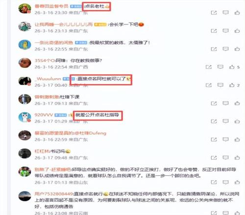 球迷紛紛評論杜鋒,“直接點名阿杜就可以了”、“就差公開點名杜指導”、“杜鋒隻會甩鍋”、“直接點名就行,在球迷不知曉任何內部情況下,隻能靠猜靠陰謀論,所以說網上的謠言四起不是沒有原因,為何要割裂球隊與球迷之間的關係呢,宏遠的公關向來做的就不好,包括傷病通告”。球迷說得不錯,媒體人別跑剛背豬說的也不錯,如果內涵杜鋒也沒有錯,杜鋒確實是一個罵人和甩鍋見長的教練,三連冠前六年無冠,三連冠後又五年無冠了,如今江郎才盡,黔驢技窮,連一個陣容嚴重不全、排名非常靠後的新疆隊也打不過,主場大比分輸給遼寧隊太丟人。如今5戰4負,威信掃地,原來支持、讚美他的球迷也紛紛倒戈痛批他。大家都要求杜鋒下課,都說杜鋒一日不走,廣東隊就沒有出頭之日。