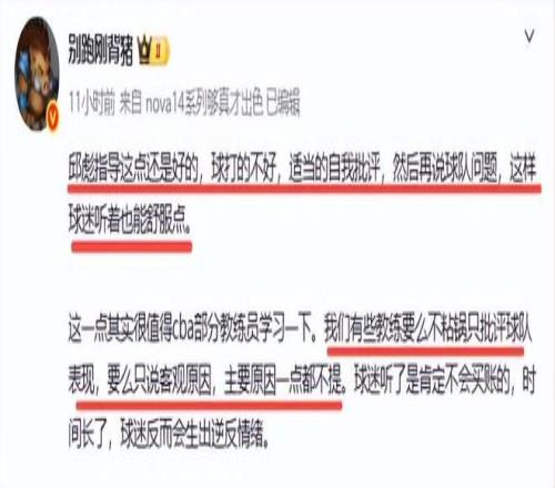 值得注意的是,山東隊輸球後,邱彪賽後已是多次攬責和向球迷道歉。昨晚仍然是如此,先攬責後再批評隊員,批評也就讓人接受了。邱彪的做法也獲得媒體人的點讚。別跑剛背豬就在社媒表揚了邱彪,同時暗批了一些教練,就差點說出名字了。