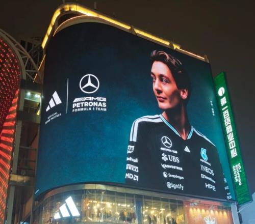 各個核心商圈鋪滿了f1車手的廣告:奔馳車手拉塞爾的臉占據了南京東路阿迪達斯樓上的大屏,另一邊的大屏則被勒克萊爾的粉絲包下來做成了應援廣告;“汽車人”維斯塔潘代言的喜力啤酒海報用莫名其妙的廣告詞吸引著路過的人;汽車模型品牌比美高在商場快閃店門口立起了一溜車手人形立牌。