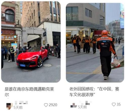 賽場之外,F1的影響力也漫溢在上海。F1車隊工作人員在開市客采購的畫麵被超市員工拍下來,作為“開市客大牌有保障”的佐證;法拉利車手勒克萊爾和妻子逛豫園時被上海大爺攔下擺pose;淘寶閃購外賣員和邁凱倫車隊的工作人員穿著同款橙黑外套在街頭迎麵相遇,“外國人回去感慨中國賽車文化氛圍十分濃厚”;在餐廳吃飯、逛優衣庫,都能偶遇一兩個賽車手。