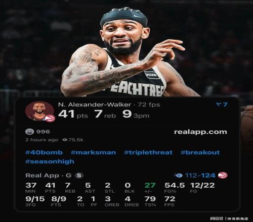讓海角HJDO43.CCM把時鍾撥回那場對陣魔術的魔幻之夜:沃克化身三分狙擊手,21次出手如手術刀般精準,12次命中靶心,其中14次三分出手竟洞穿網窩!當終場哨響,41分的生涯新高伴隨著7個籃板、5次助攻與2次搶斷,+27的正負值如同給對手判了死刑。要知道,上賽季在森林狼時,他場均不過9.4分,而如今在老鷹的65場鏖戰中,他已蛻變為場均20.3分的得分利器,3.2記三分命中數位列隊內第二,僅次於全能戰士傑倫-約翰遜(23分10.4籃板8.1助攻1.3搶斷的恐怖數據)。
