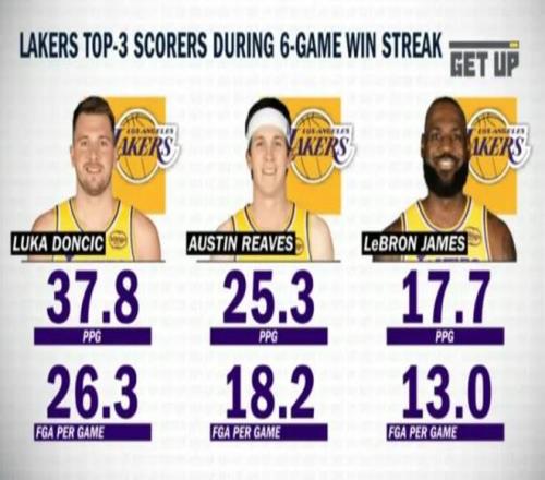 3月18日,目前湖人已經取得43勝25負的戰績,豪取六連勝,排名西部第三,根據美國媒體統計,在過去六連勝期間,湖人三巨頭表現出色,東契奇場均貢獻37.8分,裏弗斯25.3分,詹姆斯17.7分。