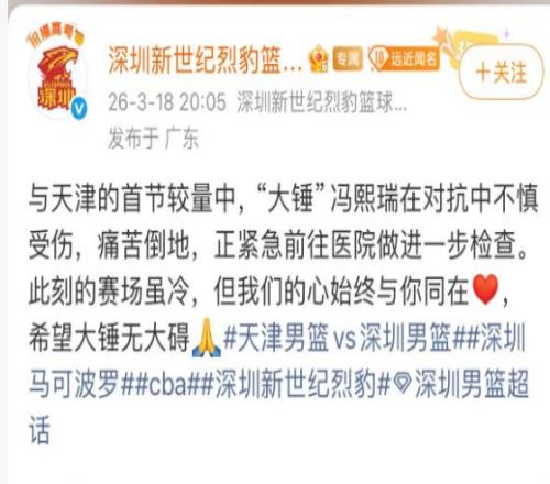 馮熙瑞的具體傷情,還需要等待檢查之後,深圳男籃官方的進一步通告。