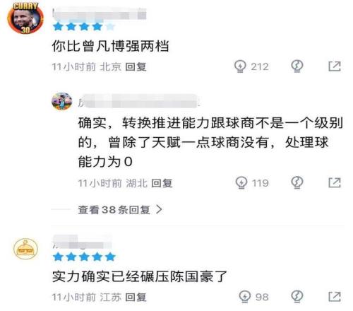 相較於北京目前因傷作壁上觀,且名氣大於實力的曾凡博,鄒陽這種踏踏實實、一步一個腳印打出來的校園鋒線,確實更應該值得入選國家隊。球迷也熱議道:“你比曾凡博強兩檔,轉換推進能力跟球商完全不是一個級別”,另外也有球迷拿他和同屆的狀元郎陳國豪做對比:“實力確實已經碾壓陳國豪了。”