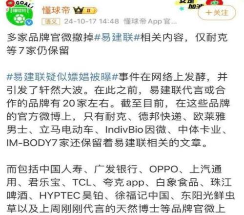 相關話題即刻引爆全網,質疑聲、否定聲、情緒化指責如潮水般席卷各大平台。多家品牌方緊急下架其形象物料,終止聯合推廣;而身處漩渦核心的易建聯及其運營團隊,則全程未發布任何聲明,未作任何澄清,亦未開啟任何形式的公開溝通。