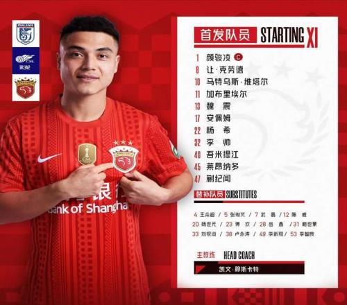 海港首發:門將是顏駿淩,後防線:楊希和李帥打兩個邊後衛,吾米提江和魏震組成雙中衛。前場:維塔爾和克勞德組成雙後腰,前場:加布裏埃爾、蒯紀聞和安佩姆一字排開。前鋒是萊昂納多。