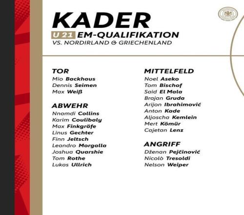在本月的國際比賽日期間,德國U21國青隊將會在U21歐青賽的預選賽中對陣北愛爾蘭U21和希臘U21。