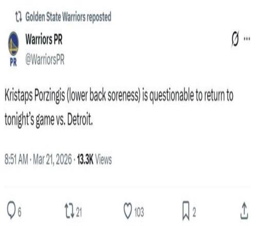 勇士隊巴特勒報銷,庫裏、塞斯庫裏、波斯特、穆迪、霍福德悉數因傷缺席,同時波神在出戰半場後傷退,勇士官方給出的原因是下背部酸痛。