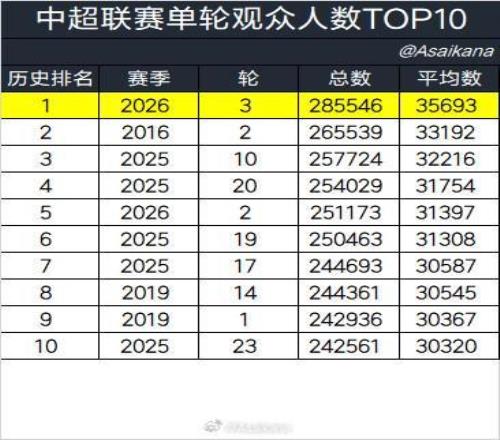 中超第3輪觀眾總人數285546人,創造中超單輪上座人數新紀錄