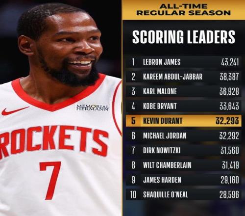 此役,杜蘭特砍下27分,職業生涯總得分超越了喬丹,升至NBA曆史第5位!