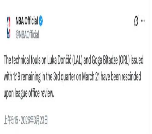 NBA宣布:撤銷東契奇的第16次技術犯規。