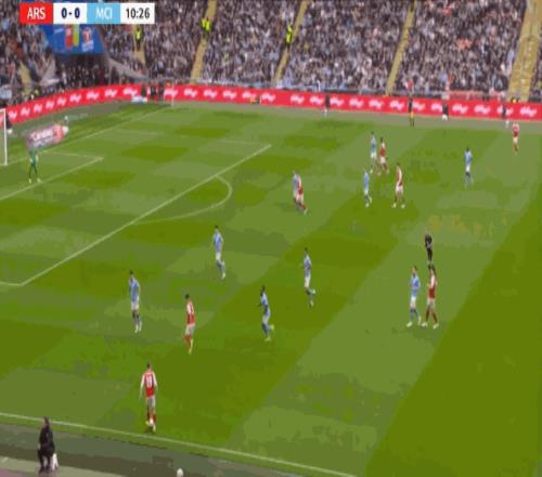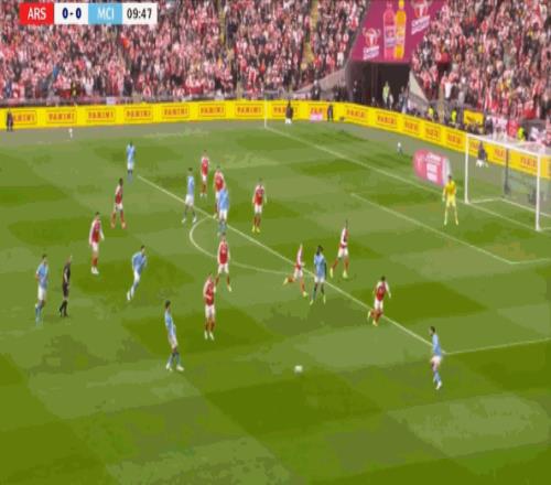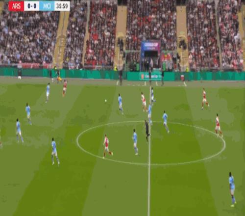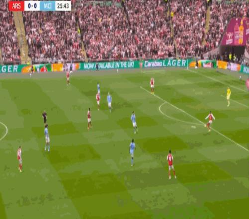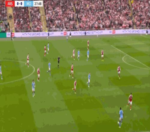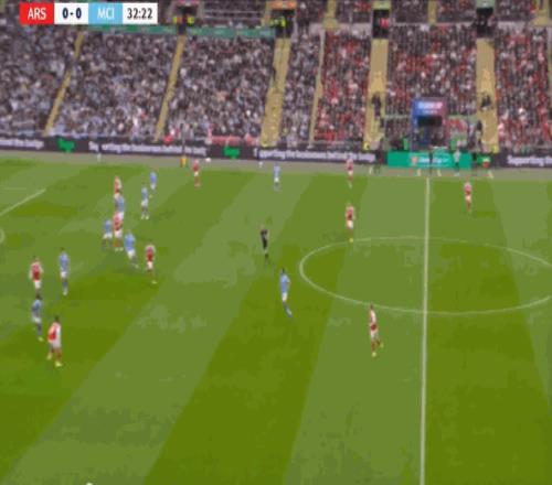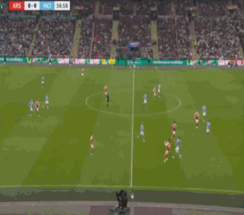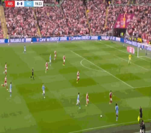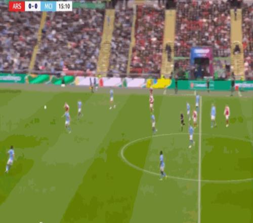 曼城通過右路打出優勢,阿森納在場上的形勢就開始轉而被動,因為在隊形被壓回去之後,阿森納變得很難彈出,比如這次反擊,哈弗茨和賴斯就在衝擊中沒能做好: